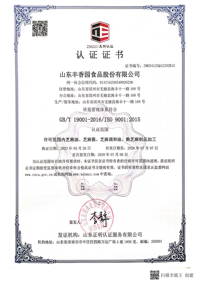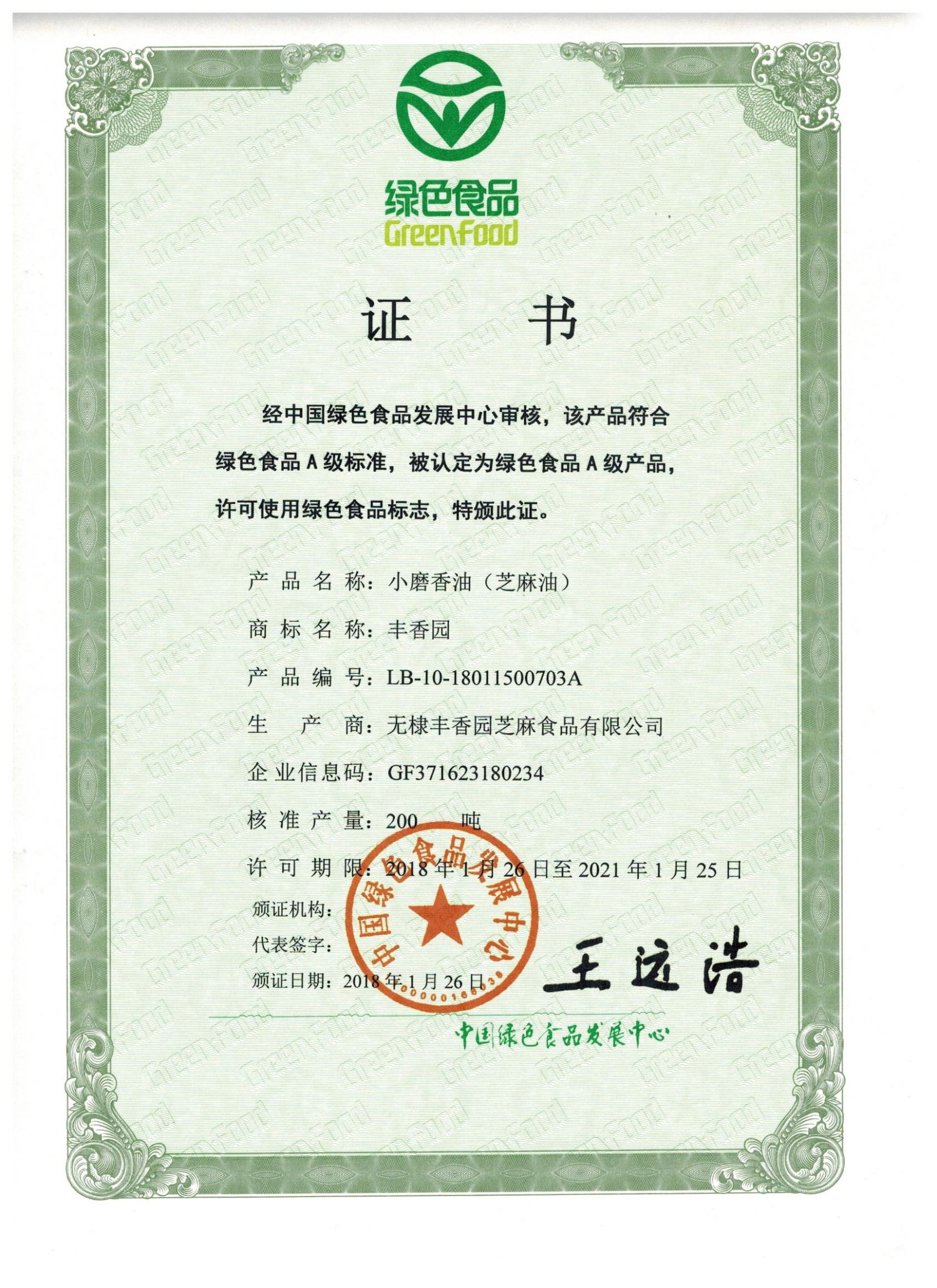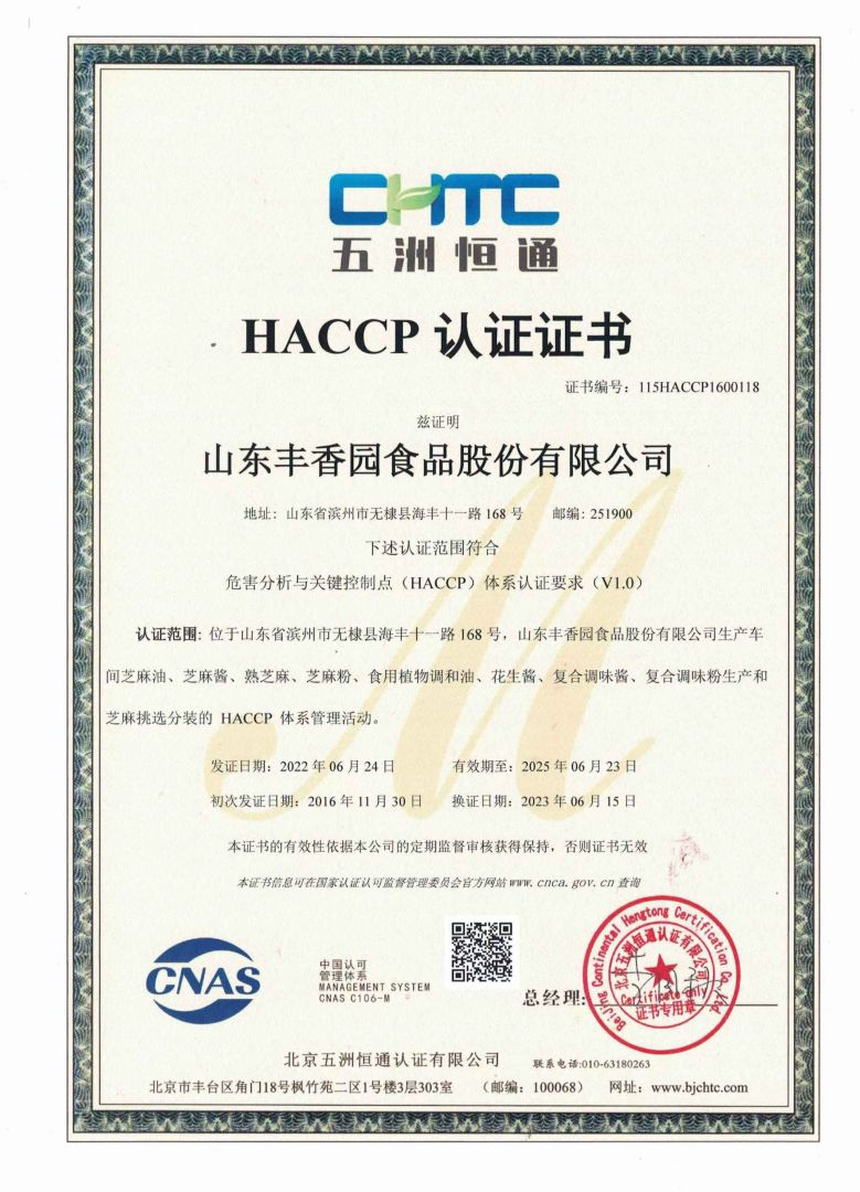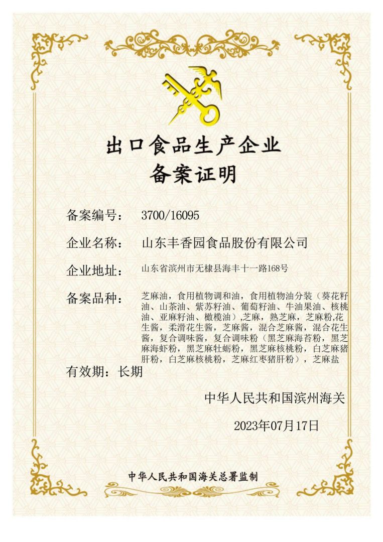 ? ? 豐香園小磨香油、芝麻調(diào)和油、花生醬、芝麻醬、混合醬、熟芝麻制品均已通過英國零售商協(xié)會(huì)BRC認(rèn)證、歐盟 美國和國內(nèi)有機(jī)、HACCP體系認(rèn)證,是山東省出口食品備案企業(yè)。