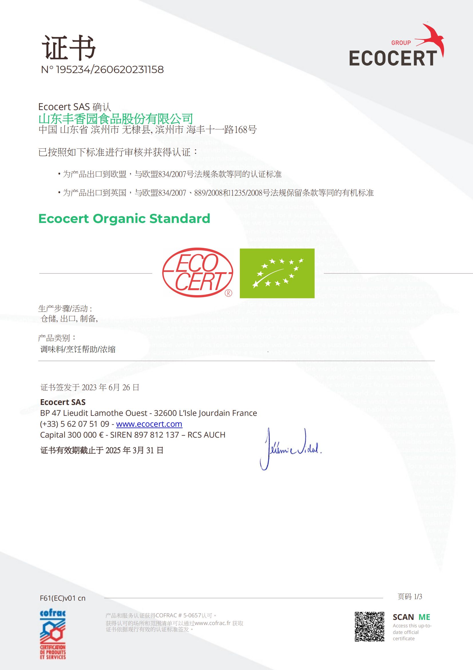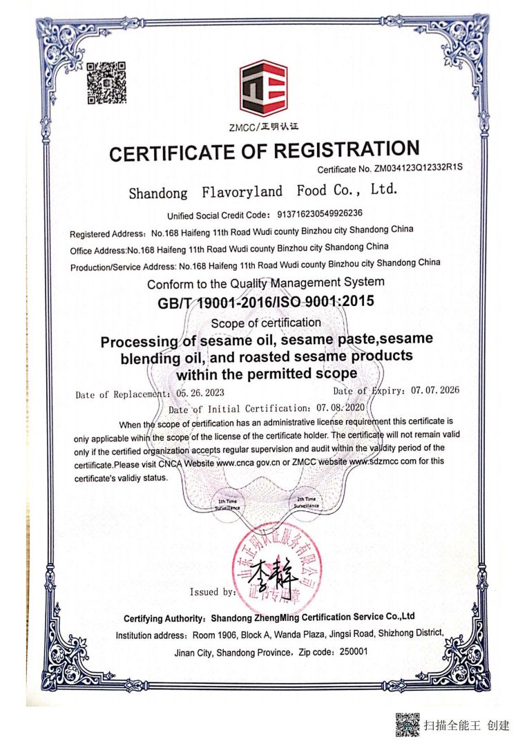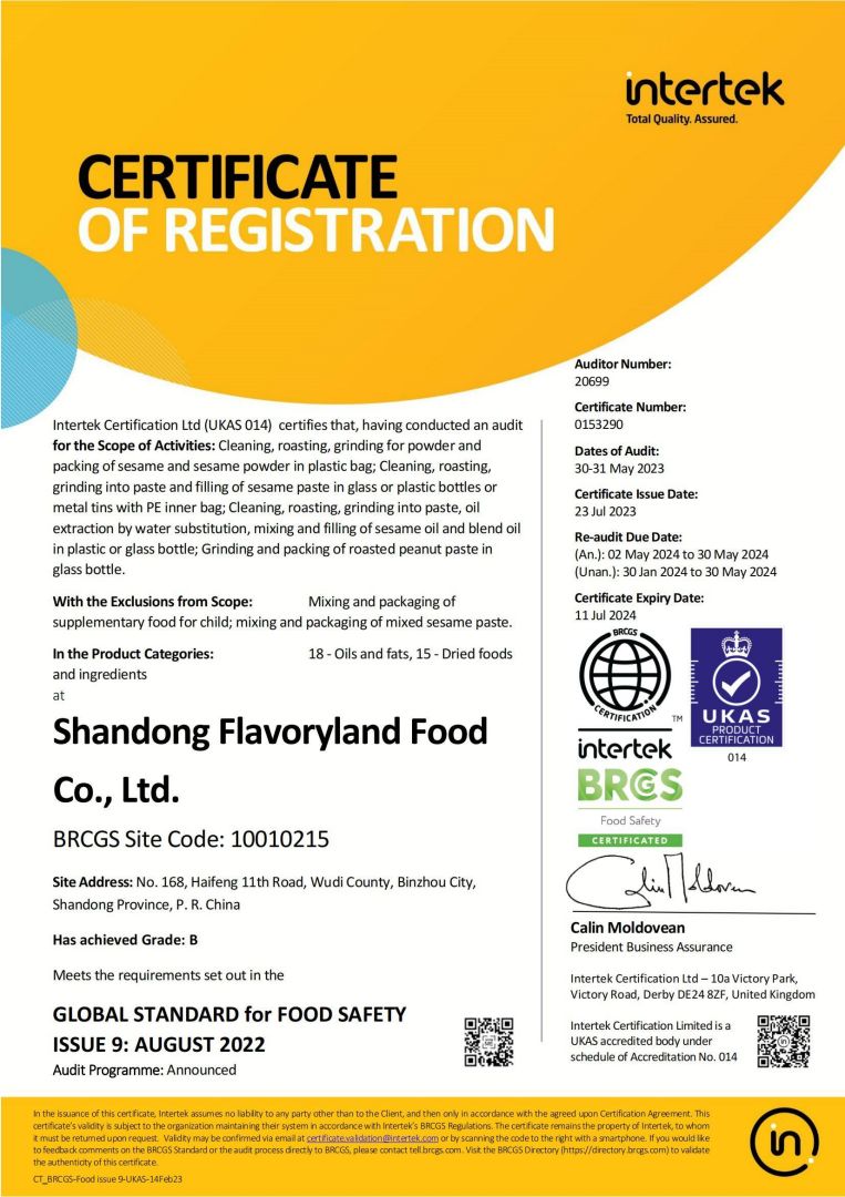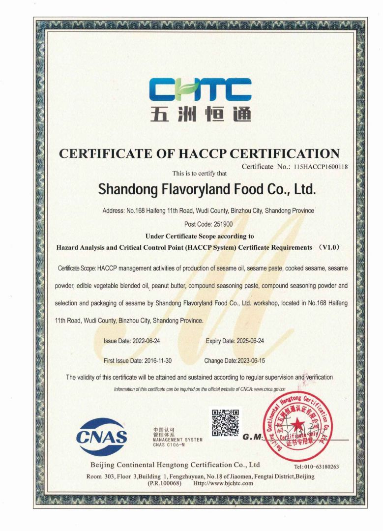 ? ? 豐香園小磨香油、芝麻調(diào)和油、花生醬、芝麻醬、混合醬、熟芝麻制品均已通過英國零售商協(xié)會(huì)BRC認(rèn)證、歐盟 美國和國內(nèi)有機(jī)、HACCP體系認(rèn)證,是山東省出口食品備案企業(yè)。